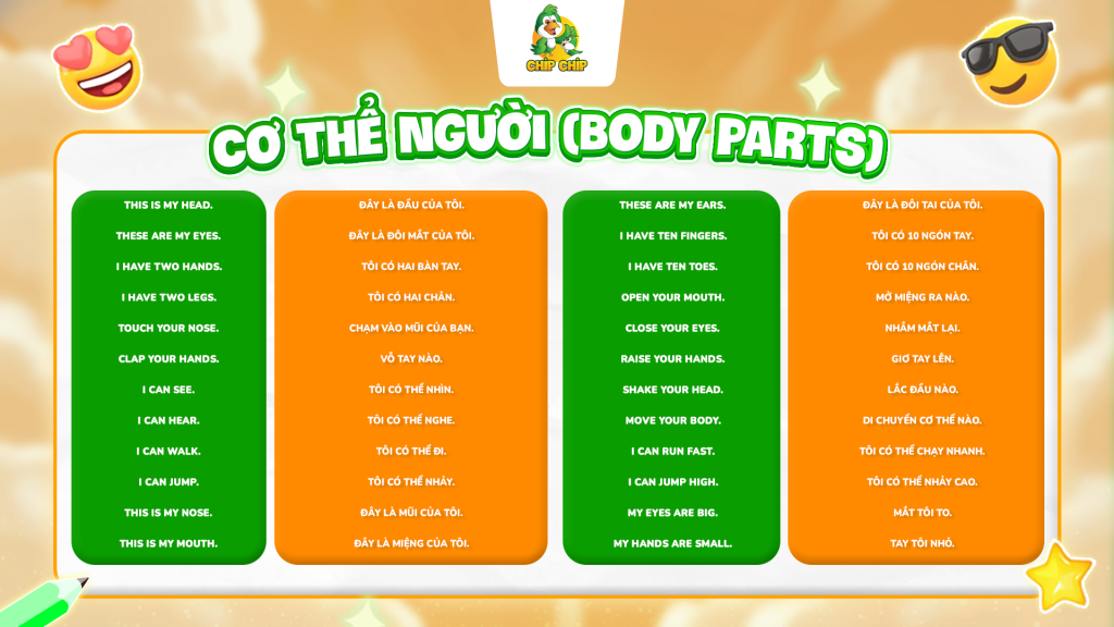 Đây là một trong những chủ đề “quốc dân” khi dạy tiếng Anh giao tiếp cho trẻ tiểu học. Vì chủ đề này vừa gần gũi, vừa dễ kết hợp với các hoạt động vận động. Trẻ không chỉ học bằng tai mà còn học bằng cả cơ thể – sờ, chỉ, nhảy, vỗ tay… nên khả năng ghi nhớ sẽ nhanh và lâu hơn rất nhiều.