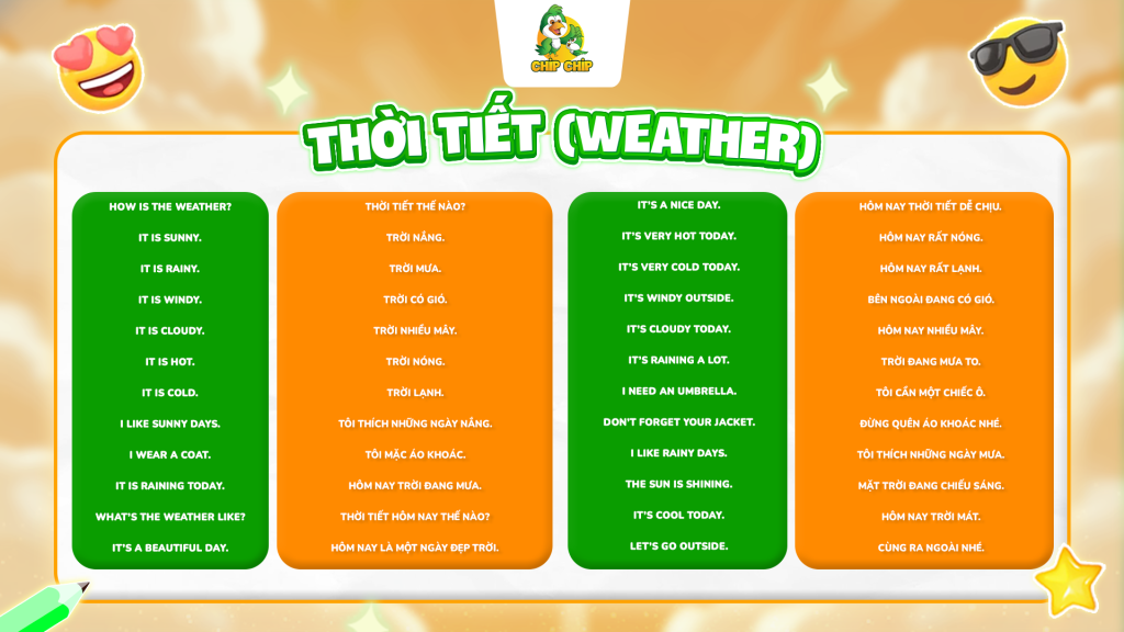Một trong những chủ đề thường được nói đến của người nước ngoài khi gặp nhau là thời tiết. Chủ đề này giúp trẻ mô tả môi trường xung quanh – một kỹ năng giao tiếp đơn giản nhưng hữu ích khi trò chuyện với những người bạn mới.
