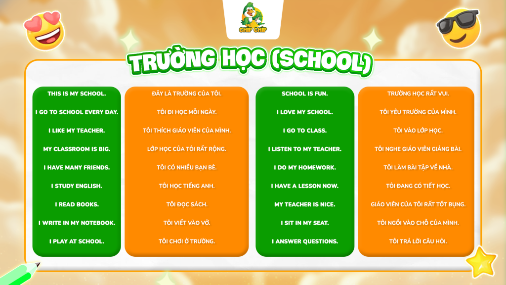 Trường học là môi trường trẻ tiếp xúc mỗi ngày, nên khi học các mẫu câu giao tiếp trong chủ đề này, trẻ có thể ứng dụng ngay lập tức. Đây là nền tảng quan trọng cho tiếng Anh giao tiếp cho trẻ em từ lớp 3 trở lên.