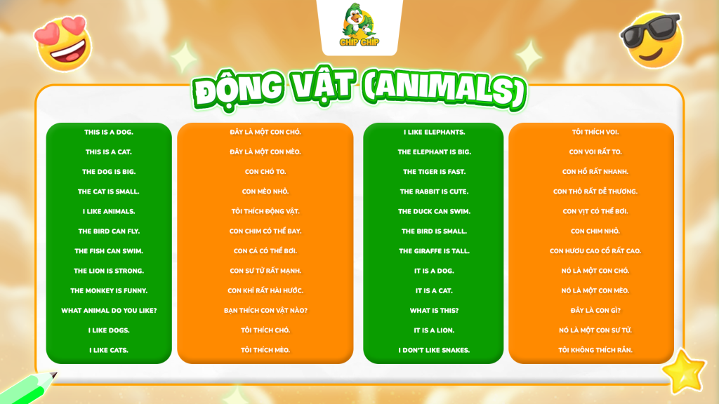 Động vật luôn là một trong những chủ đề khiến trẻ nhỏ yêu thích. Từ những con vật quen thuộc như chó, mèo cho đến những loài hoang dã như sư tử, khỉ… tất cả đều kích thích trí tò mò và trí tưởng tượng của trẻ. Chính vì vậy, khi dạy tiếng Anh giao tiếp cho trẻ tiểu học, đây là chủ đề cực kỳ dễ tạo hứng thú và giúp trẻ chủ động tham gia vào bài học.