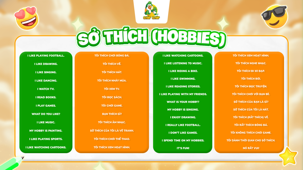 Khi trẻ có thể nói về điều mình thích, việc học sẽ trở nên thú vị hơn rất nhiều. Đây là chủ đề giúp tăng động lực học tiếng Anh cho trẻ nhỏ, cũng như luyện cho bé cách diễn đạt ý tưởng và ước mơ của mình bằng tiếng Anh.