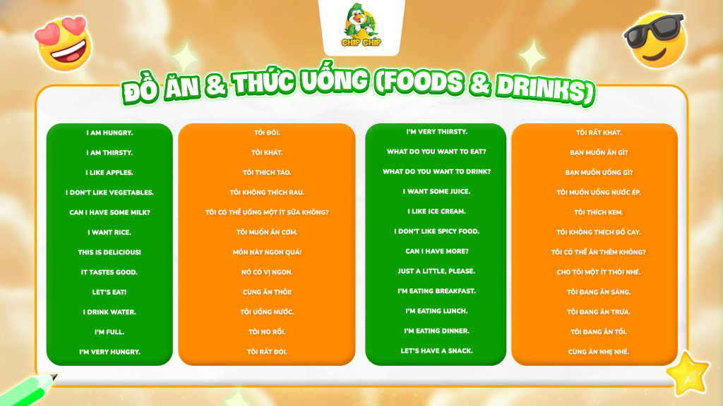 Đây là chủ đề cực kỳ “đời sống”, giúp trẻ giao tiếp trong các tình huống thực tế như ăn uống, gọi món. Trẻ nói thành thạo về chủ đề này có thể giao tiếp cơ bản trong những chuyến du lịch của gia đình rồi đó!