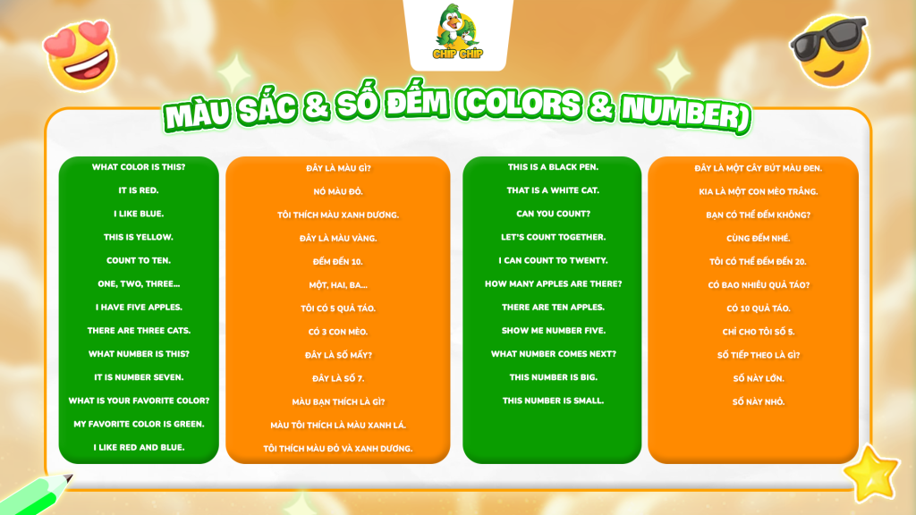 10 mẫu câu giao tiếp thông dụng chủ đề màu sắc & số đếm (Colors & Numbers)