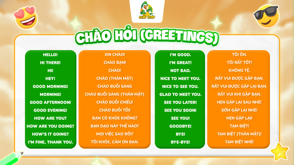 Đây là chủ đề “nhập môn” nhưng cực kỳ quan trọng trong hành trình học tiếng Anh giao tiếp cho trẻ tiểu học. Với chủ đề này, trẻ sẽ học cách bắt đầu một cuộc hội thoại, thể hiện sự lịch sự và kết nối với mọi người.