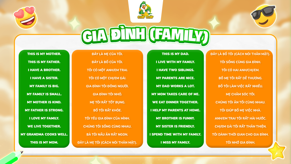 Gia đình là nơi gần gũi nhất với trẻ, vì vậy đây là chủ đề giúp trẻ dễ dàng nói và liên hệ thực tế. Khi học chủ đề này, trẻ không chỉ học từ vựng mà còn biết cách giới thiệu và kể về người thân – một kỹ năng giao tiếp rất quan trọng.